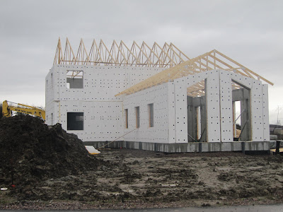 Kuvia on käyty näpsimässä raksalta vähän väliä, yleensä pimeällä. Olen odottanut, että saadaan keskeneräisten kattojen päältä pressut pois liehumasta ja taloa kiertävät rakennustelineet purettua, että saisin vähän parempaa kuvaa talosta. No, pressut on lähteneet ja vuokratelineiden purku on raksamiehellä työn alla sen, mitä hän lastenhoidolta ehtii. Nämä onkin näitä tässä raksaprojektissa uusia haasteita, että raksamiehellä ei oikeasti ole hirveästi aikaa ja mahdollisuuksia tuohon rakentamiseen. Viime taloa tehdessä minä olin kotiäitinä ja lastenhoitohaasteita ei ollut, mutta nyt on toisin. Minä olen töissä arkisin kuuteen ja lauantaisinkin iltapäivään ja noina aikoina raksamiestä tarvitaan kotona lastenvahtina. Vähiin jäävät ajat, jolloin raksalla pystyisi pitempään jotain tekemään ja nytkin ne ovat olleet lähinnä pilkkopimeitä talvi-iltoja. Isovanhemmat meillä asuu kaikki muutaman sadan kilometrin päässä, joten helpotuksia ei lastenhoitoon oikein ole saatavilla. Toistaiseksi tämä ongelma on tilassa "ratkaisematon", mutta huhtikuussa viimeistään minä jään äitiyslomalle, joten sitten helpottaa. Olen kehottanut raksamiestä laittamaan tarvittaessa vaikka jäitä hattuun, tilanne on nyt tämä ja raksa voi vaikka odottaa sen muutaman kuukauden, jos niikseen tulee. Meillä on keväästä koko loppuvuosi aikaa rakentaa, ei tässä mitään paniikkia tarvitse siis kehittää. Vaikka tokihan sitä haluaisin valmiiseen uuteen kotiin itsekin, ennemmin kuin myöhemmin!